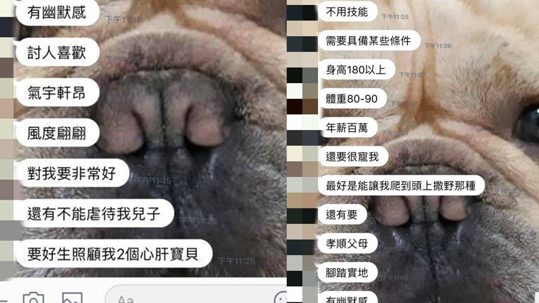 大家對於另一半,總是有著許多想像,也希望能符合心中理想的樣子,而原PO就好奇身邊的女性友人,對於找另一半會有那些條件,因此詢問「你對於一個男人要具備那些技能,才會是100分呢?」而友人也說出心內話,列舉她心中的另一半條件,也就是「身高180以上、體重80-90、年薪百萬、還要很寵我、最好是能讓我爬到頭上撒野那種、孝順父母、腳踏實地、有幽默感、討人喜歡、氣宇軒昂、風度翩翩、對我要非常好、不能虐待我兒子、要照顧我2個心肝寶貝」。
