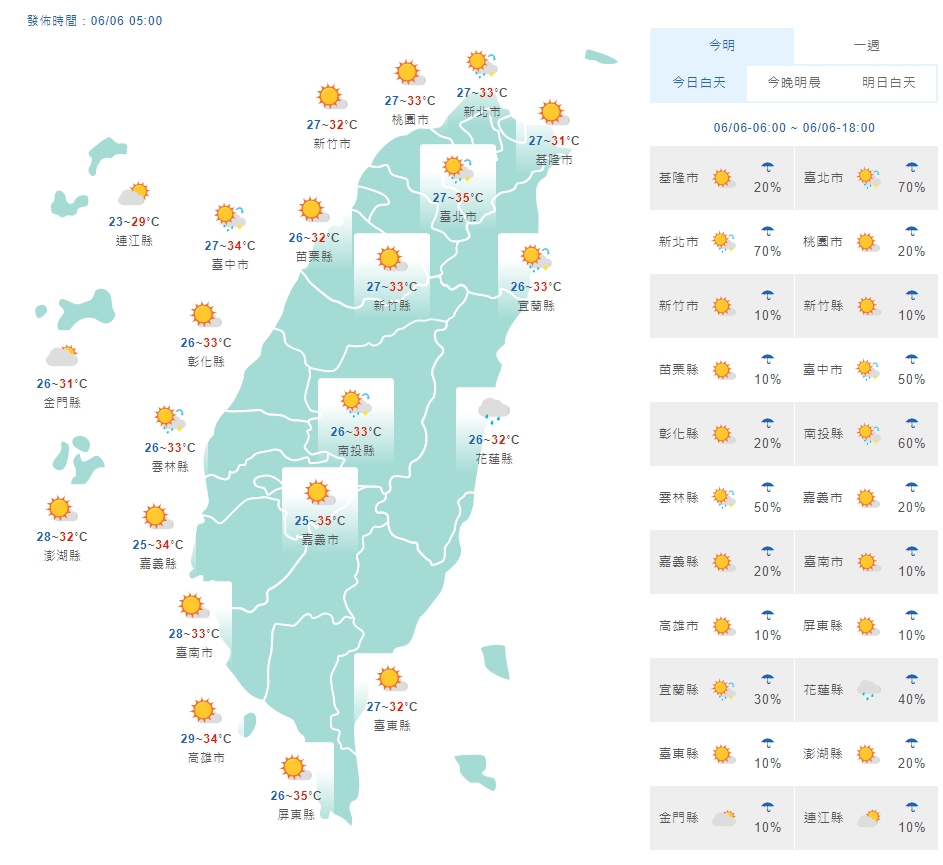 天氣熱到爆!今(6)日太平洋高壓勢力稍微減弱,各地大多仍以多雲到晴的天氣為主,但午後降雨的範圍較廣,除各地山區仍容易出現午後雷陣雨外,中部以北及東北部平地出現午後雷雨的雨勢也更為明顯。值得注意的是,氣象局針對台北市、高雄市、屏東縣和台南市發布高溫資訊,可能會出現36度高溫。