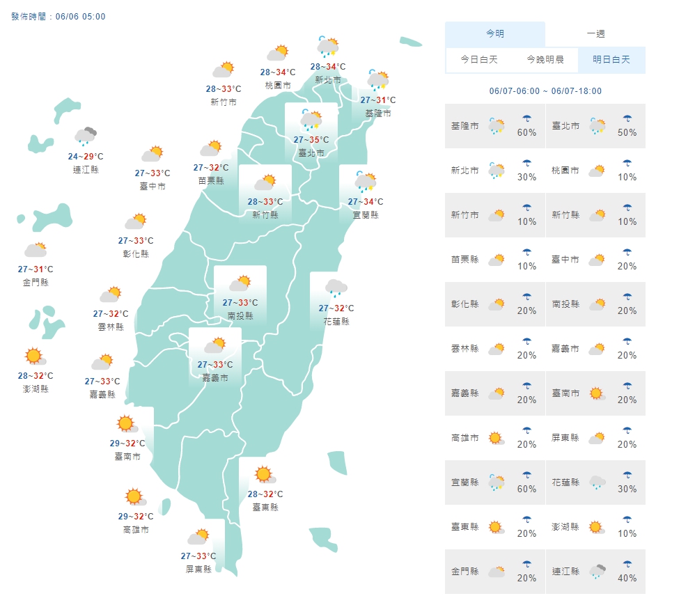 明(7)日是端午節,各地大多仍維持多雲到晴的天氣,上午天氣穩定,午後在中部以北、東北部地區及南部山區有局部短暫雷陣雨,風向轉為西南風,除東部及東南部偶有零星降雨外,中南部沿海地區也有局部短暫陣雨。在氣溫方面,各地高溫約32至35度。