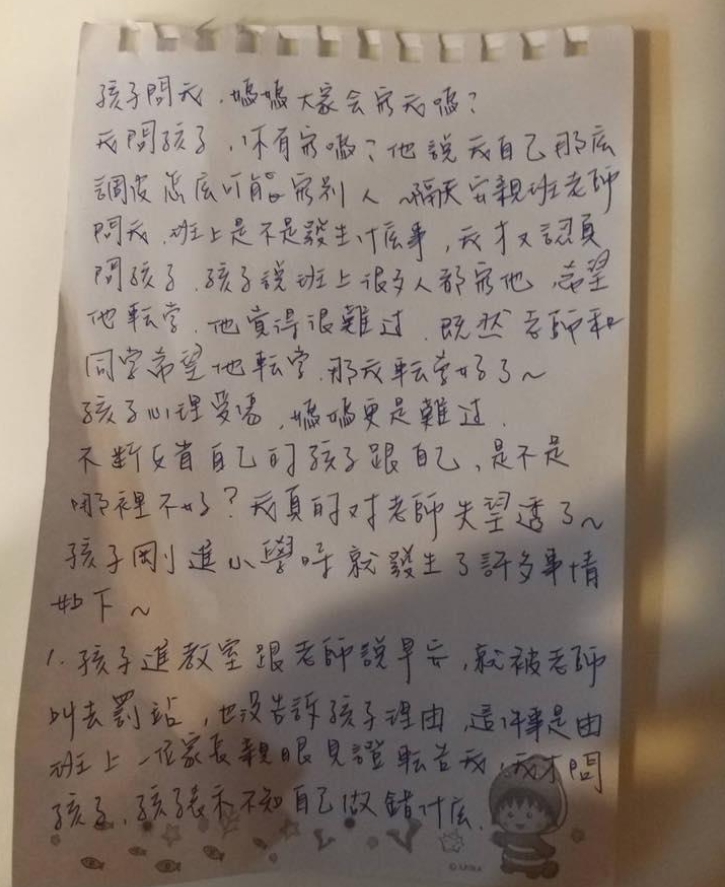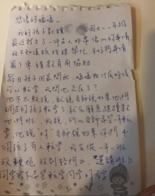 女網友在臉書《爆怨公社》貼出姊姊準備向教育局陳情的手寫信,透露孩子5月28日返家後,突然詢問「媽媽我什麼時候可以轉學?」在追問之下,他才緩緩吐露,老師對同學表示「如果調皮的孩子轉學了,就會願意繼續任教」,並且從教室門口一路放鞭炮到校門口,說完便請全班同學投票,寫下最希望轉學同學的名字。
