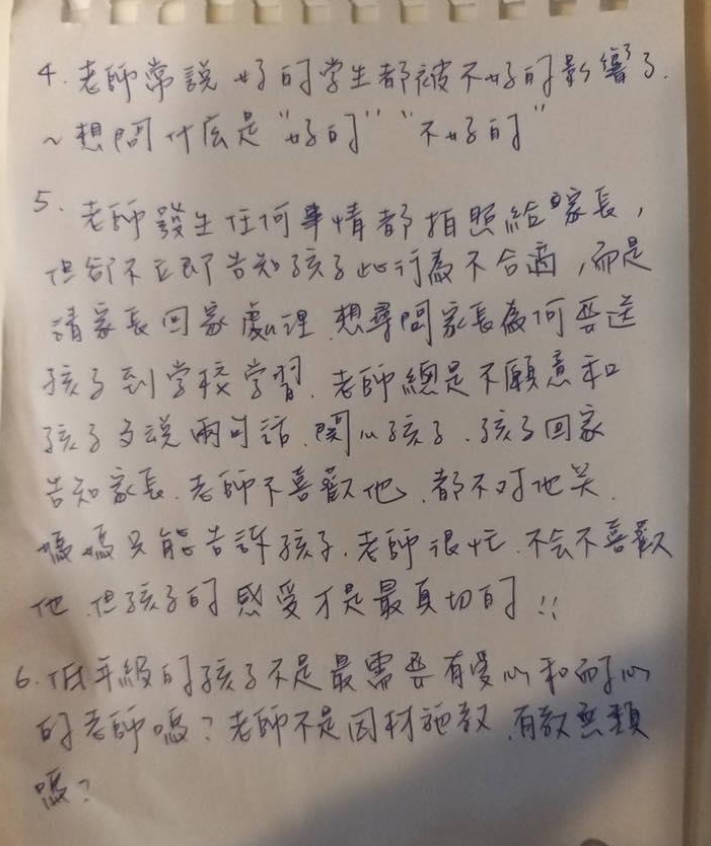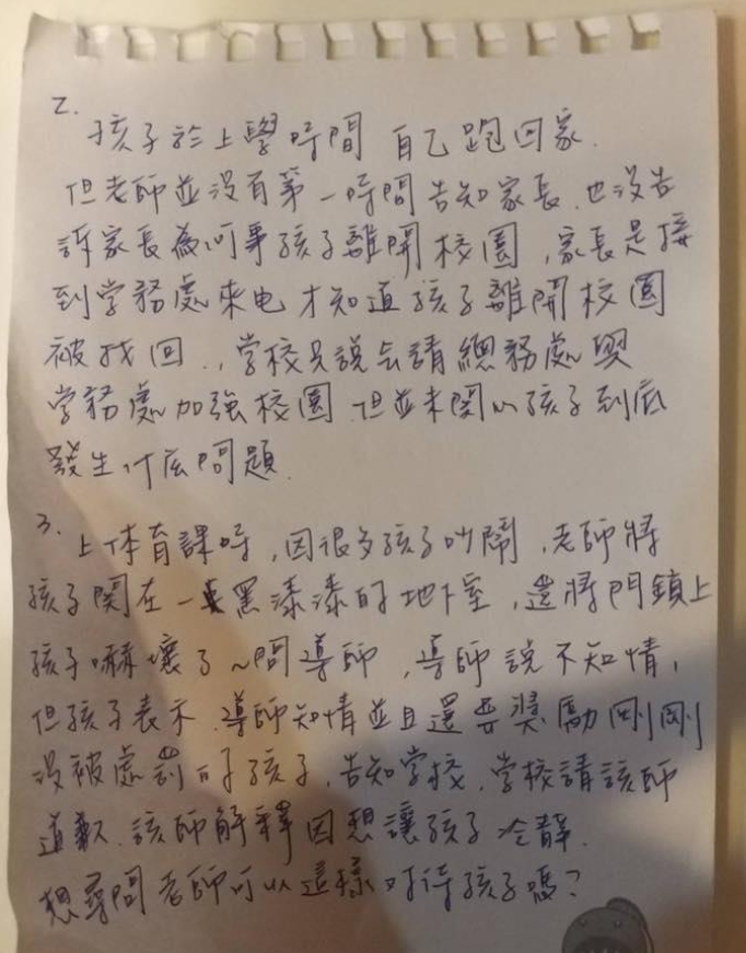媽媽也在手寫信中提到,曾發生孩子向老師說早安,就在完全不知道理由的狀況下被叫去罰站。還有次孩子在上學時間自己跑回家,老師卻沒有在第一時間告知家長,也沒告訴家長孩子離校的原因,直到學務處來電才得知孩子已被找回。另外,孩子上體育課不乖,竟被關在一片漆黑的地下室,讓他覺得很無助,漸漸意識到老師不喜歡自己。她認為老師時常將孩子的行為拍照傳給家長,卻不立即告知孩子需要改進的地方,此方式並不恰當,「低年級的孩子不是最需要有愛心和耐心的孩子嗎?」