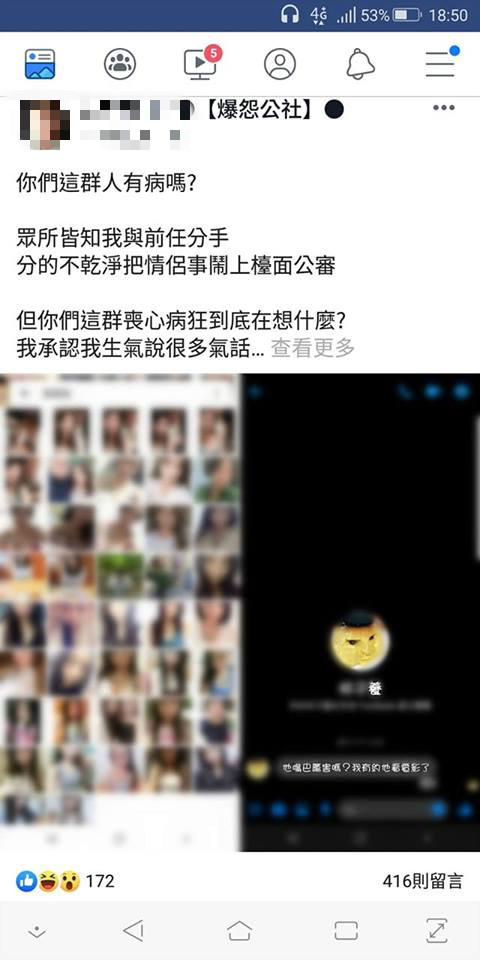 男友得知後,也發文反擊,「你們這群人有病嗎?我承認我生氣說很多氣話,也抱怨她不少事情,但我心中一直有她的位置存在…她曾經是我的小公舉(主),分手後也不可能變成仇人,再讓我知道你們想去她家敲門,我絕對弄死你」,還PO出女友的性感私密照,且不斷洗板,氣得原PO在《爆怨公社》爆氣怒嗆,「尼他X北七嗎?都分手了~一直鬼打牆,還留著前女友照片,是要打手槍嗎?XXX啦!爆怨你XX當男人沒氣度嗎?賓士有三X了不起啦!記得刷牙要用牙膏啦!」