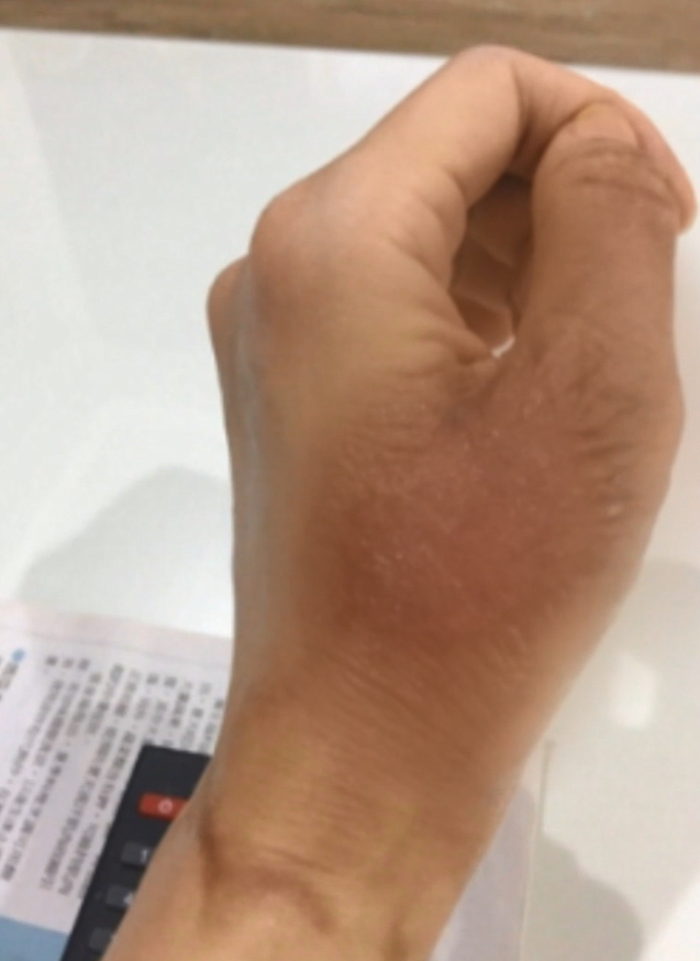 照片裡,皮膚明顯有燙傷過的痕跡,傷口從大拇指到手腕。
