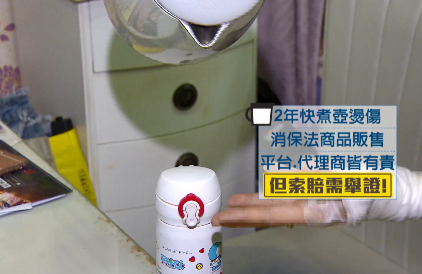 投訴人 李小姐:「就這樣倒而已,它就整個蓋子突然自己彈開了,所以才會整個水灑到我的手整個都是,還有彈到我的胸口也都燙傷。」