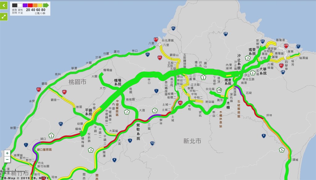根據高公局上午7時56分路況資訊,國道1號楊梅到新竹、國道3號樹林到龍潭、國道5號南港到頭城,車速都不到時速40公里;其中,國1湖口到竹北、國3三鶯到鶯歌系統,車速更低於時速20公里。