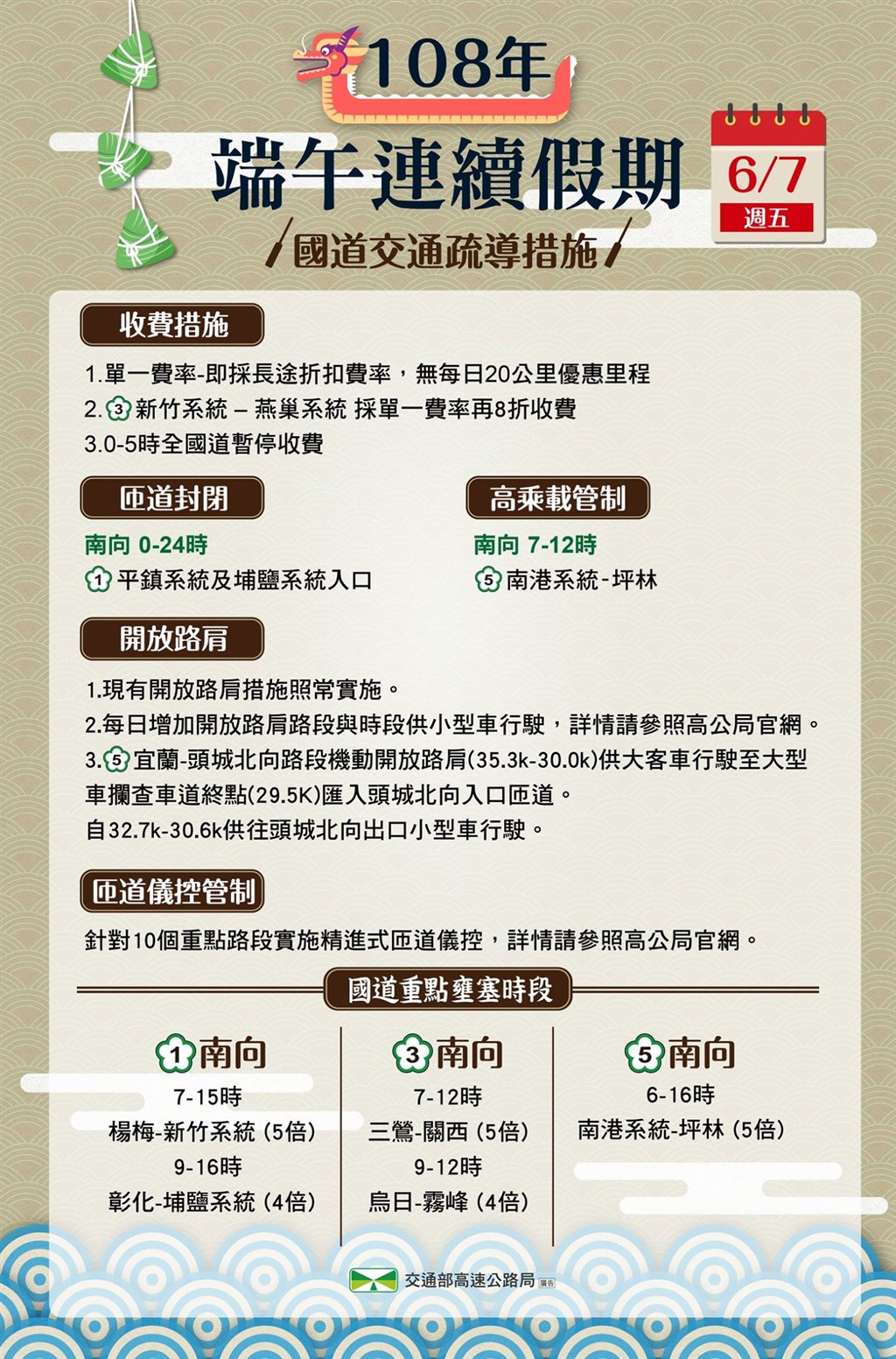 高公局今天實施的疏導措施,包括上午7時中午12時,國5南港系統至坪林南向高乘載管制、全天封閉國1平鎮系統及埔鹽系統南向入口匝道、單一費率、國3新竹系統至燕巢系統再8折收費、深夜0至5時暫停收費、開放路肩等。