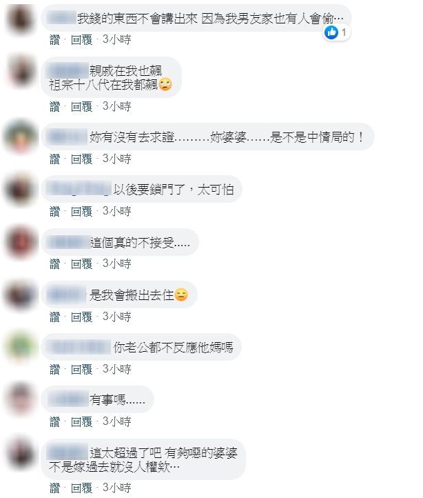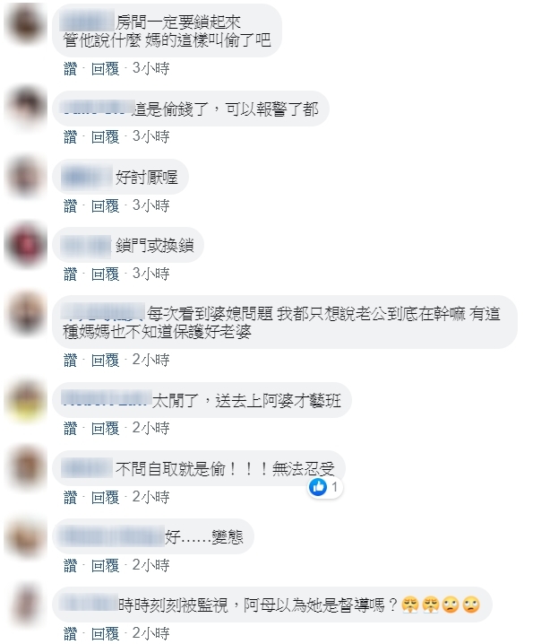 貼文一出,網友也都為原Po抱不平,痛罵:「親戚在我也飆,祖宗十八代在我都飆」、「是我會搬出去住」、「這太超過了吧!有夠噁的婆婆,不是嫁過去就沒人權欸」、「這是偷錢了,可以報警了」、「每次看到婆媳問題,我都只想說老公到底在幹嘛?有這種媽媽也不知道保護好老婆」、「如果有能力搬出去吧!這樣比較好」、「婆婆實在有夠噁心」、「也太變態了吧!偷聽是怎樣啦?拿錢也太誇張了,不會問嗎?基本尊重都沒有」。