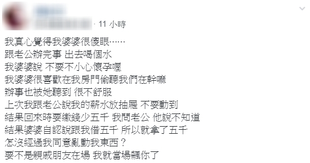 原Po還提到,有一次她領了薪水後放在房間抽屜裡,並提醒老公不要拿她的錢,未料某天要繳錢時發現薪水少了5千,原本以為是老公拿走,但詢問老公時,老公卻說「不知道」,婆婆這時才跳出來說「我跟妳借了5千」,瞬間讓她火氣爆表,直呼:「要不是親戚朋友在場,我就當場飆妳了!」