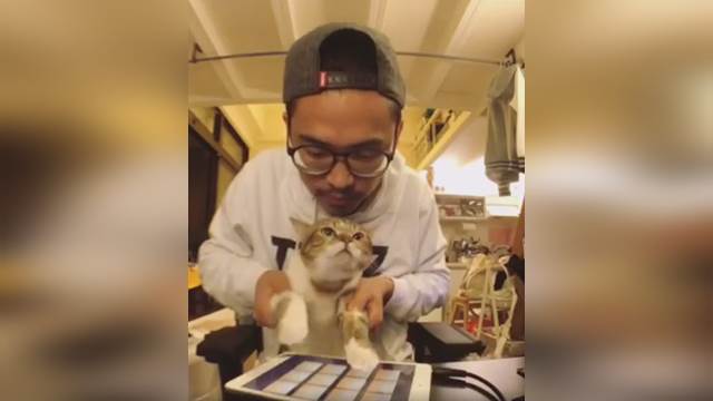 音樂節奏點頭而爆紅的人氣貓「肚臍」又有新作品啦~這次在老爸