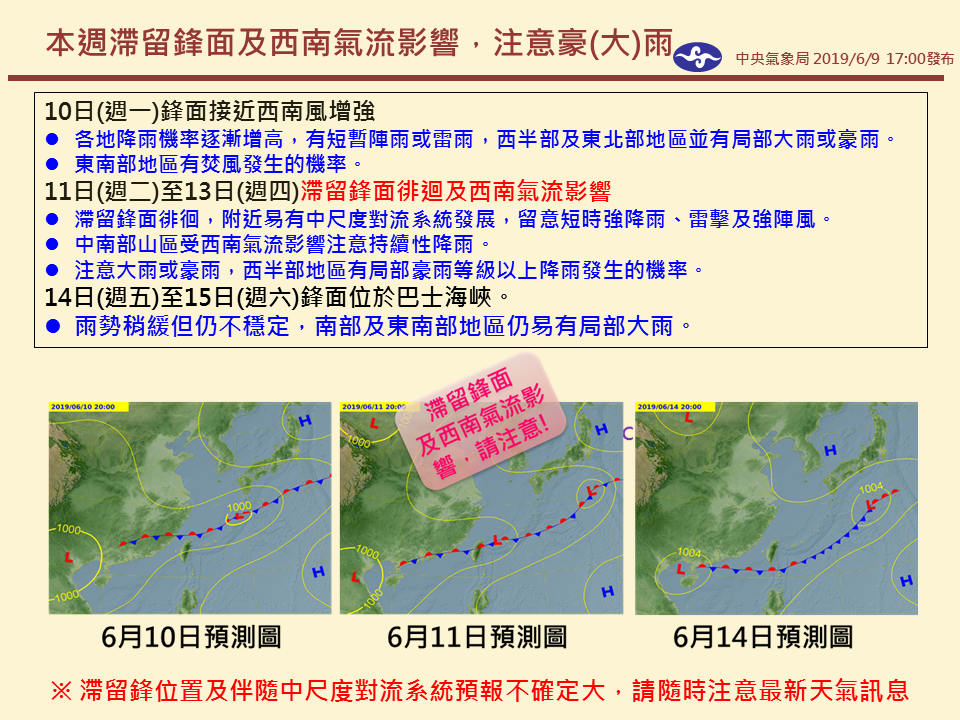 中央氣象局預報,因鋒面接近、西南風增強,今天深夜開始部分地區可能降雨,10日開始西半部將有大雨或豪雨,且降雨狀況可能持續到16日,氣象局表示因為降雨時間長,容易導致淹水跟土石坍方,得等到17日之後才有機會放晴。