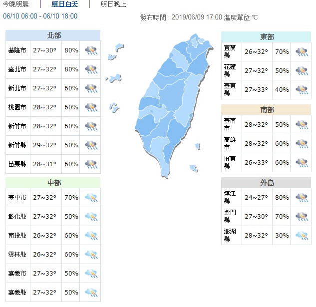▼明天10日全台天氣概況。圖/中央氣象局