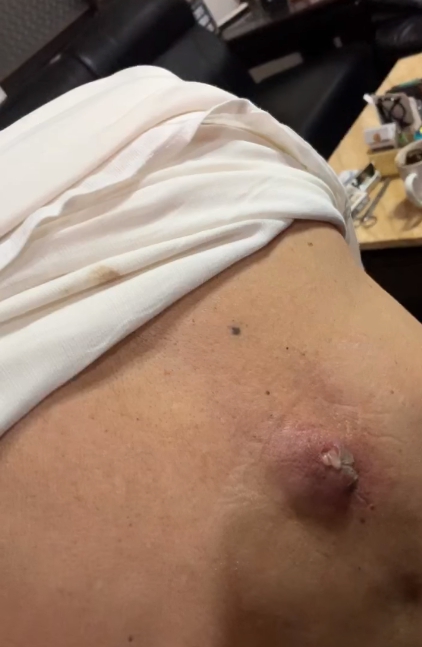 ▼90歲阿公背部長巨大粉瘤火山。(圖/網友游妍琳授權提供)