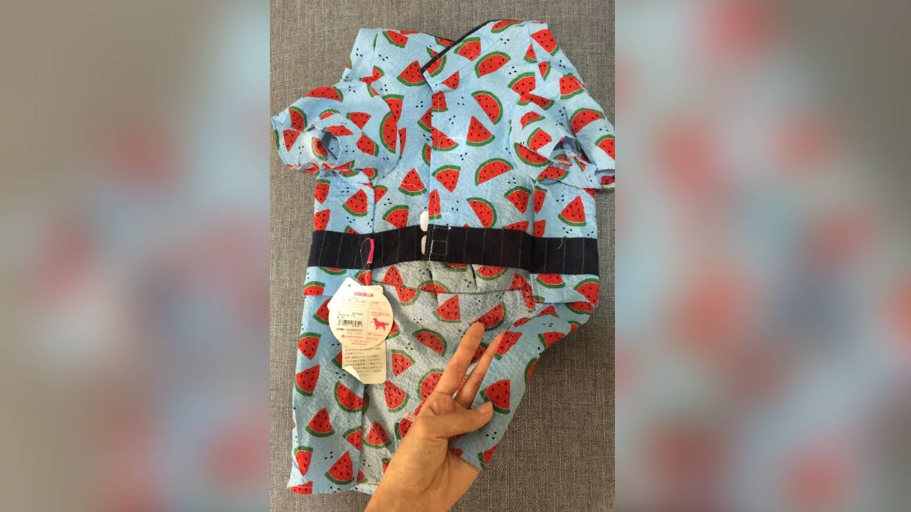 原PO表示,看到老公特別挑了一件充滿西瓜圖案的衣服送給兒子,覺得很可愛,但後來仔細一看,覺得衣服造型有些特別,因此心裡就默默想「難道日本人參加慶典時,小朋友都穿小褲褲就出門了嗎?」不過,這時她又覺得這跟自己以往看日劇的記憶不同啊!後來仔細一看衣服上的標籤,才驚覺真相,「原來這是給小狗狗穿的衣服」,讓她瞬間眼神死了。