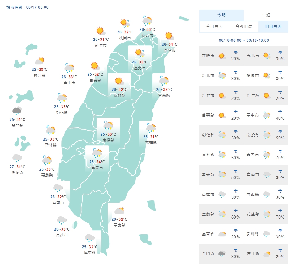氣象局預報,18日、19日仍然受到太平洋高壓影響,雖然天氣穩定且炎熱,但要注意午後雷陣雨,中南部在晨間及上午會有零星雨。在氣溫方面,各地普遍在32度以上,由於風向漸漸轉偏南至西南風,東南部有局部沉降增溫發生的機率。