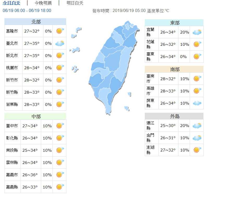 氣象局指出,今日白天台東縣為橙色燈號,有38度極端高溫出現的機率;高雄市、屏東縣近山區或河谷為橙色燈號,有連續出現36度高溫的機率。花蓮縣縱谷,台北市、新北市盆地,嘉義縣市、台南市近山區或河谷為黃色燈號。應避免非必要的戶外活動、勞動及運動,注意防曬、多補充水份、慎防熱傷害。