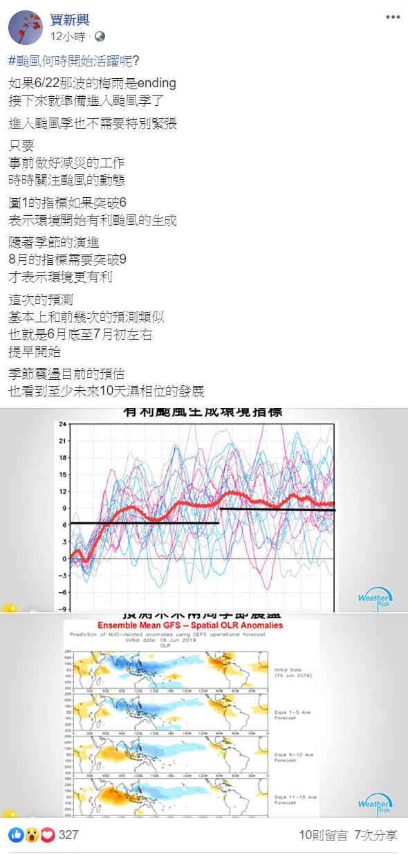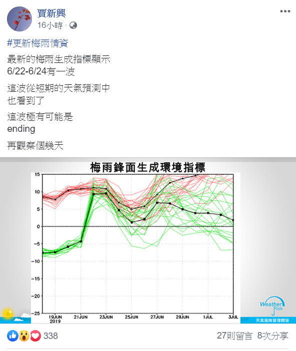 天氣風險公司總監、全台唯一災害性天氣預報士賈新興在臉書指出,最新的梅雨生成指標顯示,周六到下周一有一波梅雨,這波從短期的天氣預測中可見,「這波極有可能是ending」,不過仍須再觀察個幾天。他表示,如果下周一那波的梅雨是ending,接下來就準備進入颱風季,「這次的預測,基本上和前幾次的預測類似,也就是6月底至7月初左右,提早開始」。