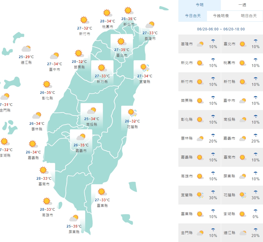 今、明(20日、21日)兩天受西南風影響,臺灣各地及澎湖大多為多雲到晴,白天晴朗炎熱,清晨僅中南部沿海地區有零星短暫陣雨,午後西半部山區及東半部地區亦有零星短暫雷陣雨,今日金門及馬祖為多雲到晴,明日金門及馬祖有短暫陣雨。