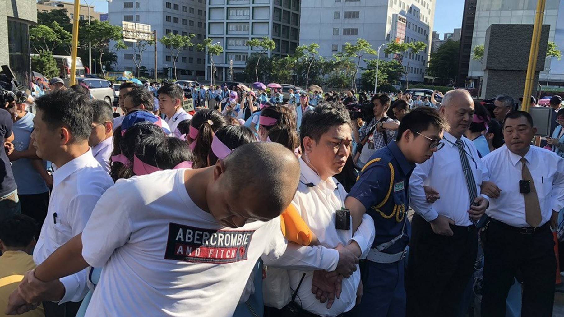 桃園市空服員職業工會罷工行動下午4時罷工開始,數百名工會成員陸續集結在長榮航運大樓門口,並在出入車道上靜坐,長榮一開始請保全人員圍成人牆,並一度和工會糾察員發生推擠,後來保全退下,改由警方出面維持續秩序。