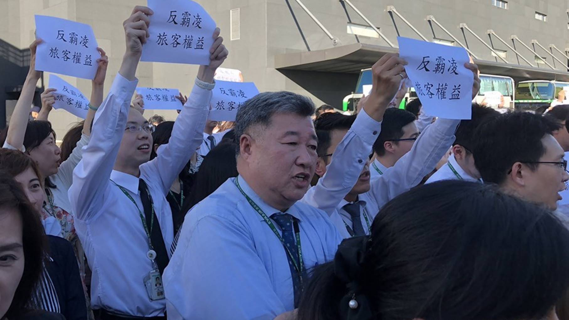 ▼長榮集團內反罷工員工也到場,高舉「反霸凌旅客權益」標語。(圖/中央社)