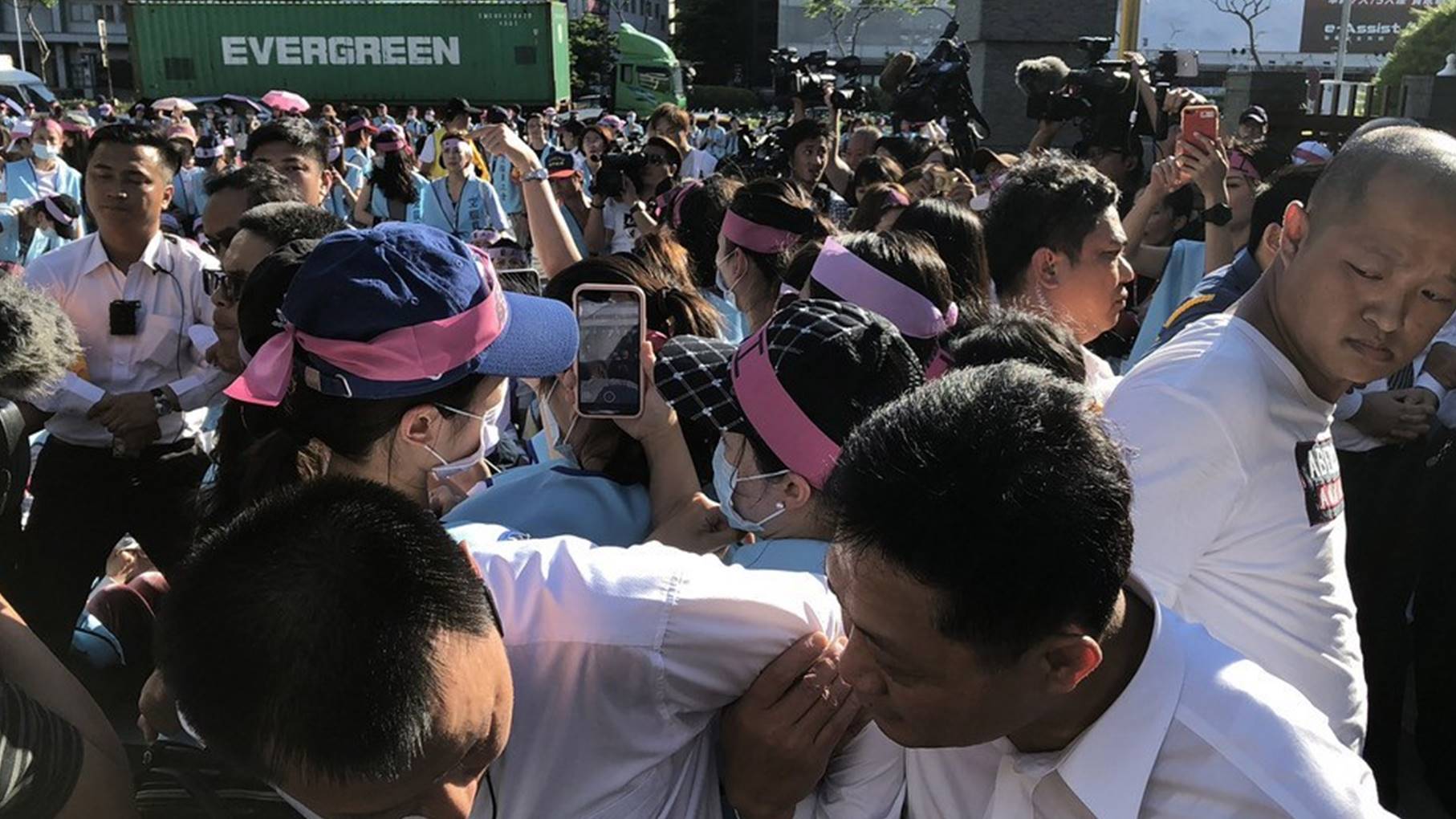長榮航空空服員下午4時到南崁長榮航運大樓門口展開罷工,高喊「合法罷工」,長榮集團員工則嗆聲「不想做,就回家」,雙方集結近千人,持續對峙互嗆。