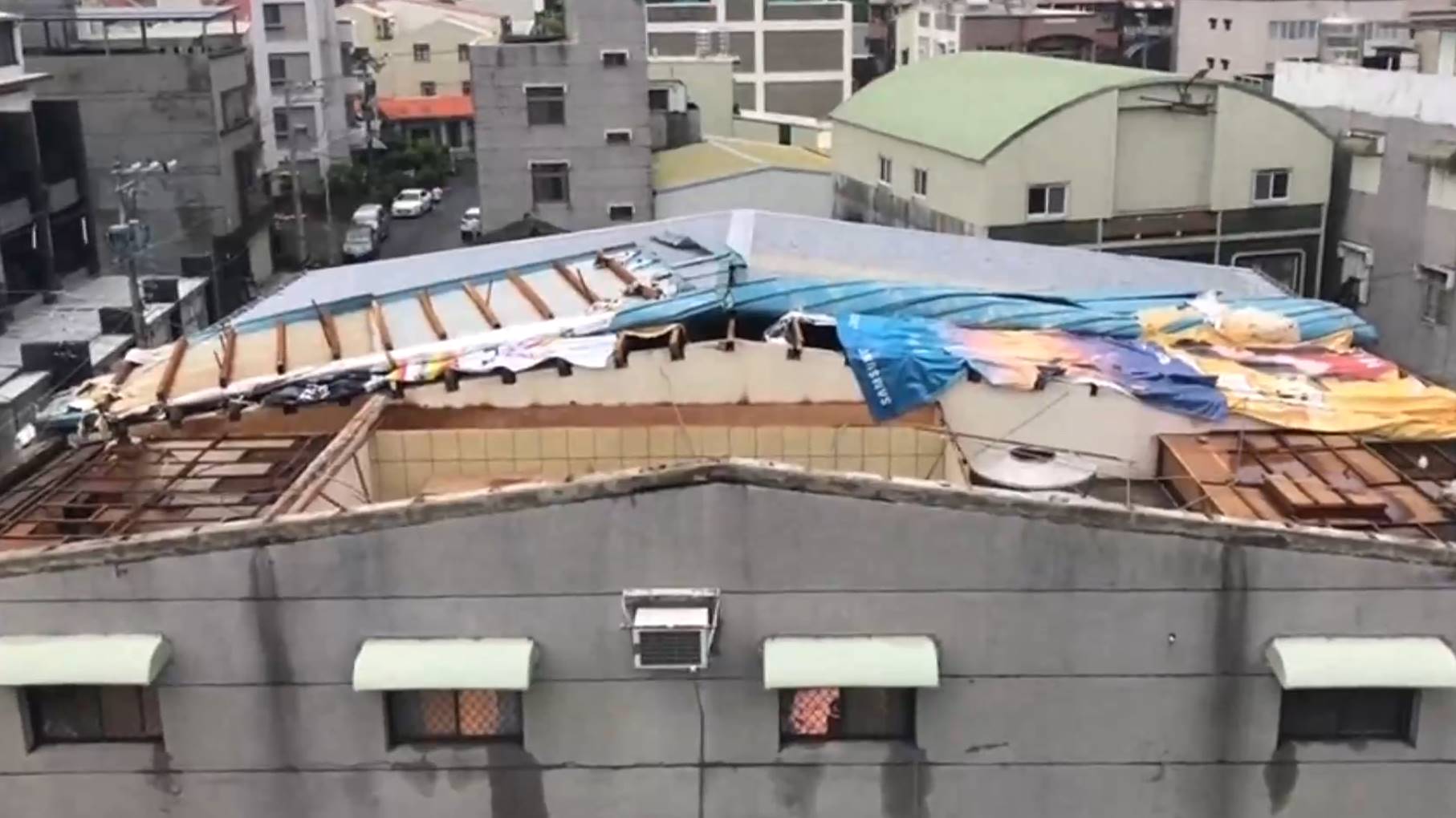 大片的屋頂一半砸在隔壁屋頂,一半掉下馬路時還砸斷高壓電線,造成2千多戶停電。