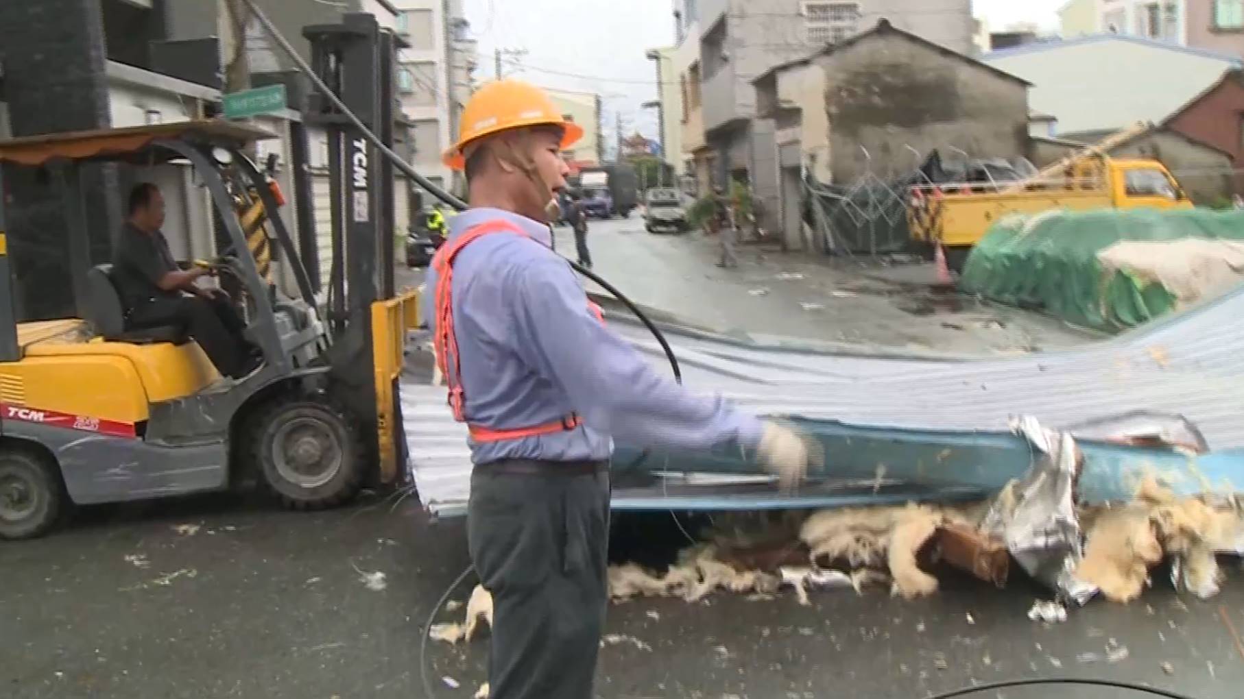 工程人員利用機具,將飛落路中央鐵皮屋頂清除,而這大半片屋頂,是由一邊天民宅三樓頂砸落,目擊的居民,說當時出現強風掀飛了屋頂。