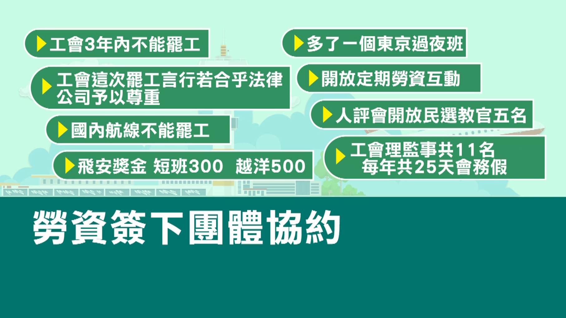 17天的馬拉松式抗爭,勞資雙方終於簽下的團體協約。重點包括,工會3年內不能罷工,工會這次罷工言行若合乎法律公司會予以尊重,國內航線不能罷工,飛安獎金短班300越洋500,多了一個東京過夜班,開放定期勞資互動,人評會開放民選教官五名輪值參與人評會議,給予工會理監事共11名每年共25天會務假。