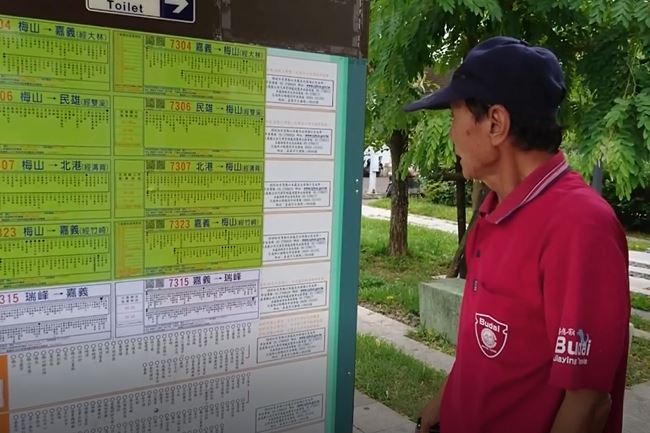 當地民眾常看到要搭車的乘客,趴地在找時刻表,梅山這裏搭公車幾乎都是老人家,還得這樣的接地氣才找得到車班,照片PO網後公車處發現,實在太對不起乘客。