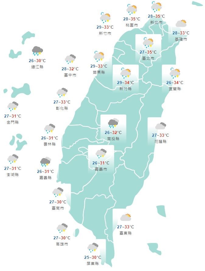 溫度方面,除南部高溫在31度上下外,其他地方沒下雨時,仍感受悶熱,高溫可來到33至35度左右,尤其花東縱谷、臺東南側及大台北容易出現36度以上高溫,紫外線指數偏高,外出請注意防曬並多補充水分。氣象局預報指出,明(11日)西南風環境內,水氣仍多,中南部有短暫陣雨或雷雨,南部地區降雨機率持續偏高、易有局部大雨,其他地區午後雷雨的現象將轉趨明顯,範圍會從山區擴展至平地,中部山區及北部平地午後亦有局部大雨發生。