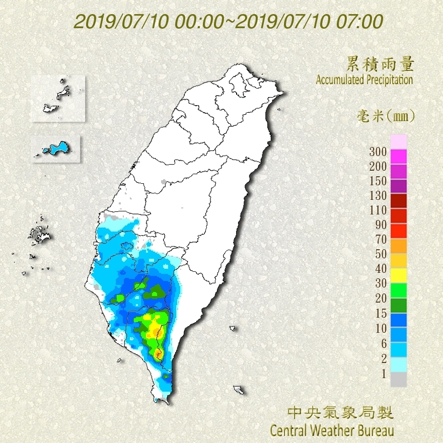 氣象局於今(10)日凌晨近4點對南高屏等縣市發布大雨特報,由於仍在西南風環境內,水氣持續偏多,南部一帶雨勢明顯、持續降雨,會有局部大雨發生,至於中部地區出現短暫陣雨或雷雨的機率也偏高,其他地區雖然大致為多雲的天氣,午後雷雨的情形轉趨明顯,範圍將從山區擴展至平地,尤其中部以北山區午後容易有局部大雨發生,前往山區活動請留意天氣變化,南部降雨機率持續偏高,民眾外出記得攜帶雨具、注意安全。