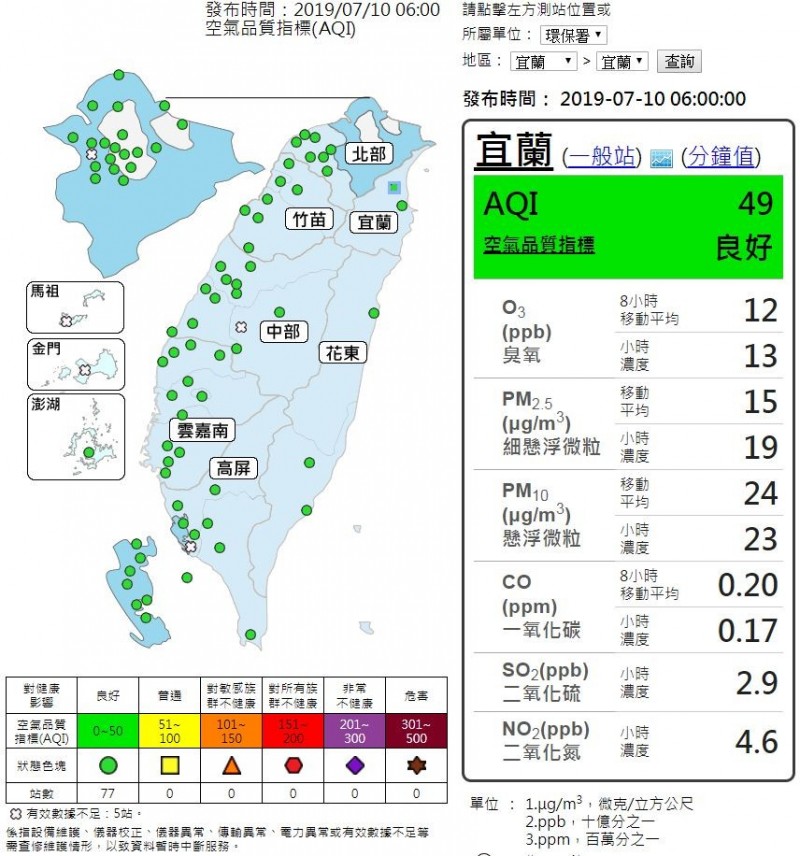 空氣品質部分,北部及宜蘭空品區局部地區擴散條件較差,污染物濃度易上升,短時間可能達普通等級;北部、竹苗、中部、雲嘉南、高屏、宜蘭、花東空品區及離島地區以「良好」等級為主。