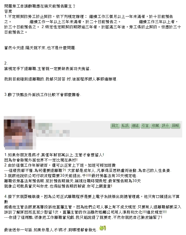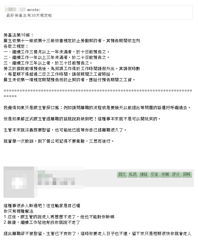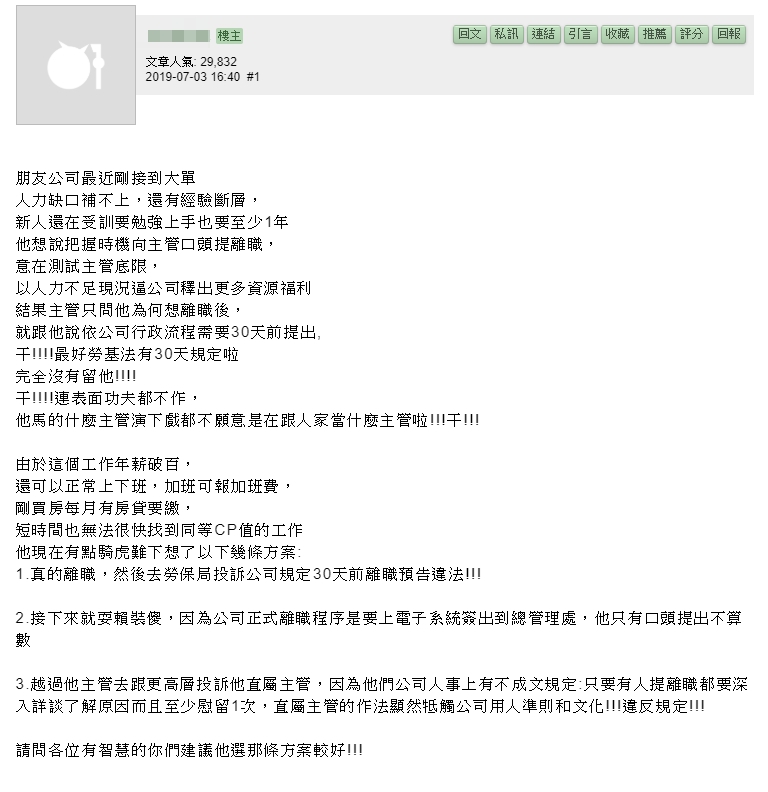 原PO激動表示:「最好勞基法有30天規定啦,完全沒有留他!X!連表面功夫都不作,他X的什麼主管,演下戲都不願意,是在跟人家當什麼主管啦!」原PO說,由於這份工作不僅年薪破百萬,還可以正常上下班、報加班費,而朋友因為剛買房,還有房貸要繳,「短時間也無法很快找到同等CP值的工作,他現在有點騎虎難下」,他們更想了3條方案,「第一是真的離職,然後去勞保局投訴公司規定30天前離職預告違法、二是耍賴裝傻,因為公司正式離職程序是要上電子系統簽出到總管理處,他只有口頭提出不算數、三則是越過主管,去跟更高層投訴他直屬主管,因為他們公司人事上有不成文規定:只要有人提離職,都要深入詳談了解原因而且至少慰留1次,直屬主管的作法顯然牴觸公司用人準則和文化!違反規定!」