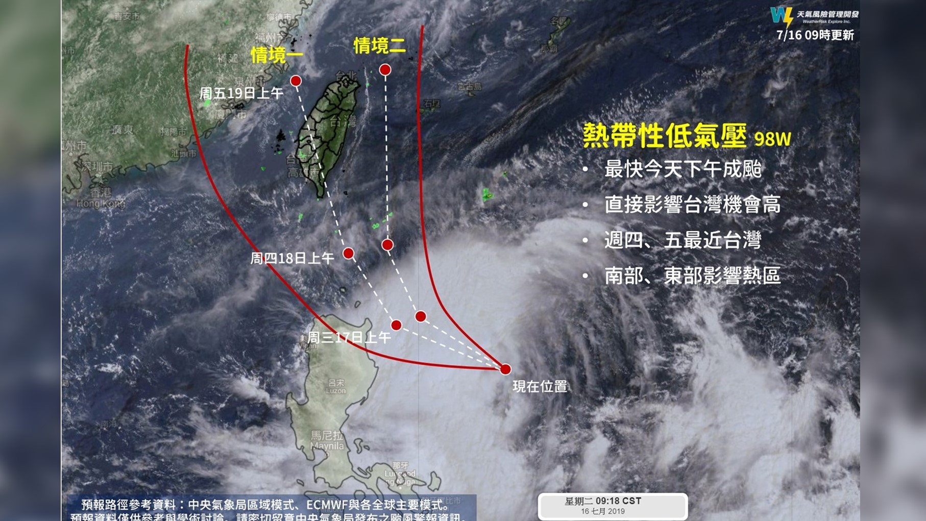另外,天氣風險公司16日中午在臉書PO文的內容則是提到,最快今天下午熱帶性低氣壓將發展為輕度颱風「丹娜絲」,直接影響台灣機會高,周四、五最近台灣,南部、東部為影響熱區,雨的影響大於風,同時根據各家預報資料,整理出2種最可能的路徑,其中「情境1」發生的機會比「情境2」稍高。
