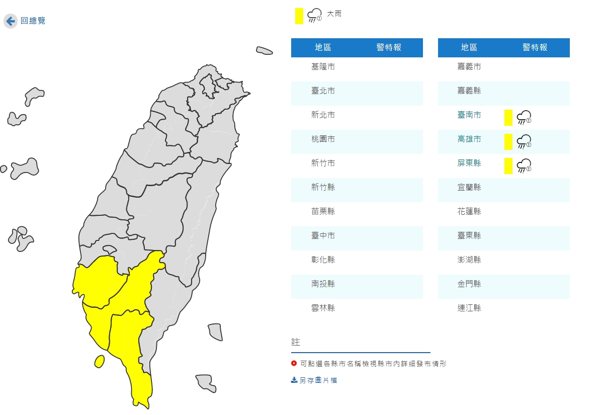 氣象局指出,尤其南部山區有局部豪雨發生機率,至於其他地區也有局部短暫陣雨或雷雨,其中午後的降雨會較為明顯,有較大雨勢發生的機率。同時也針對臺南市、高雄市、屏東縣發布大雨特報。