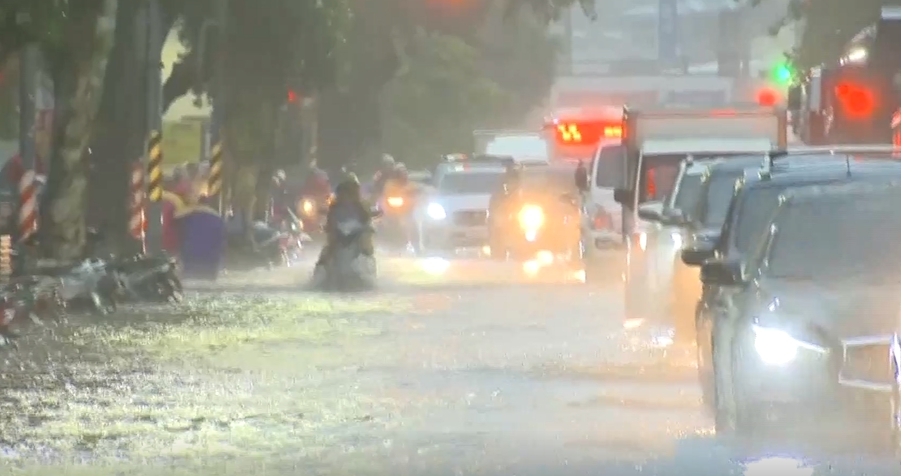 時雨量第一在楠梓,有102.5毫米,第二高的林園,雨量99.5毫米,林園出現民眾坐在公車裡,水淹到腳踝,有人趕緊把雙腳抬起,公車緩緩移動,路上滿是積水。