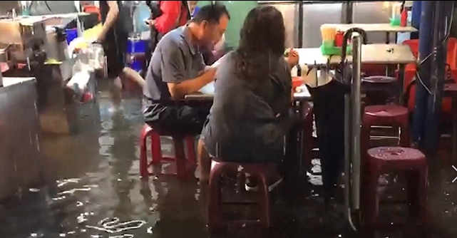 但儘管雨下的這麼大,還是沒有吃飯皇帝大,這間賣雞肉飯的名店,民眾腳泡在水裡,照樣淡定一口接一口,吃得津津有味,甚麼樣好吃的雞肉飯,民眾說,雨再大也要吃飽飯,除非淹到口鼻,否則打死不退,也被笑稱是泡水雞肉飯。