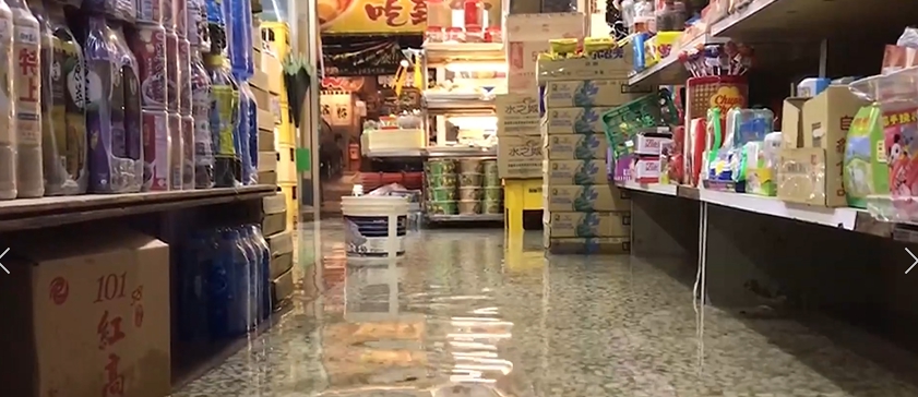 19日晚上雨炸南台灣,大雨又急又快,在雲林北港,同樣也出現淹水情形,因為雨勢宣洩不及,街上淹水高度達到小腿,不少機車泡水,而最慘的是這間雜貨店,店裡像遊泳池一樣,貨品都泡在水裡。