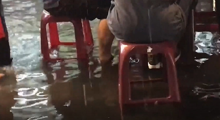 ▼水淹至腳踝,民眾邊泡腳邊吃雞肉飯。(圖/東森新聞)