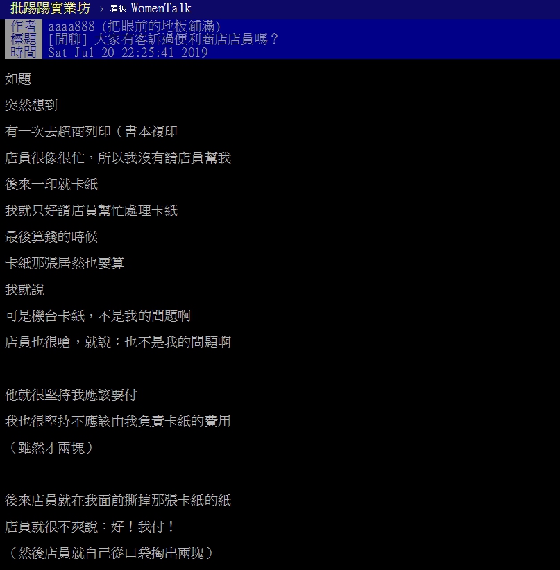 雖然只是2塊錢小事,但原PO認為機台卡紙責任不在他,不應由他默默吞下,店員見他遲遲不妥協,似乎不耐煩了,竟當著他的面把卡紙的紙撕掉,接著從口袋掏出2塊,語帶不爽地說「好!我付!」原PO透露,自己雖然沒付到卡紙錢,但店員的態度和行為讓他反感,於是他寫email去投訴,「後來就有相關人員打來詢問,我也就只是說人員需要再教育,機台需要定期保養才不會卡紙」。
