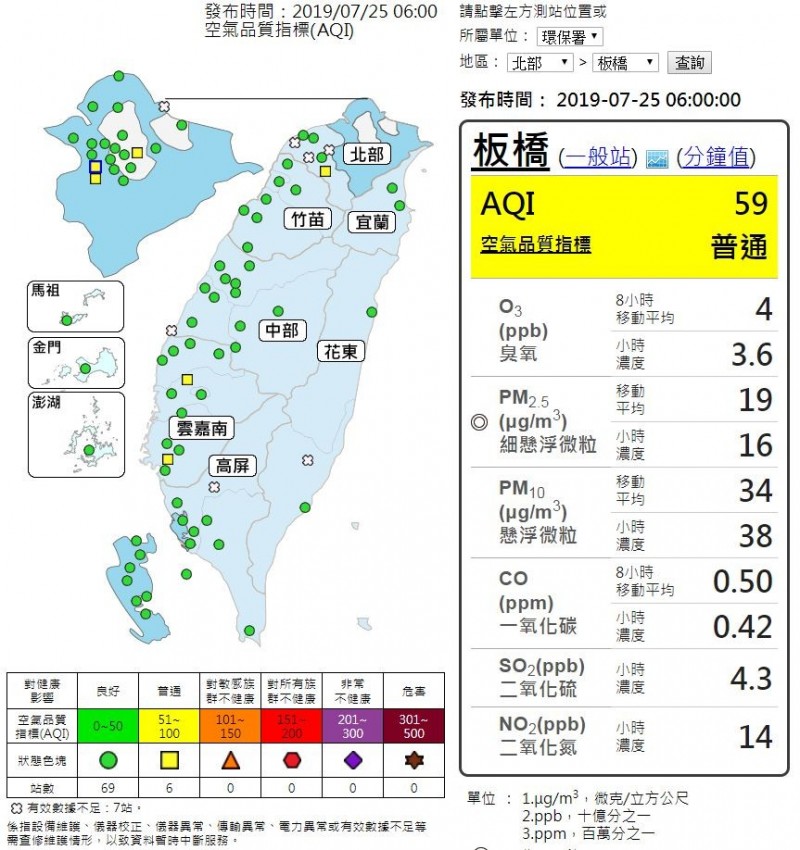 空氣品質部分,由於氣溫偏高、垂直擴散條件佳;環境風場為偏南風,北部空品區位於下風處,較易累積污染物,午後光化作用影響易使臭氧濃度上升;竹苗、中部、雲嘉南、高屏、宜蘭、花東空品區及馬祖、金門、澎湖以「良好」等級為主;北部空品區多為「普通」等級。