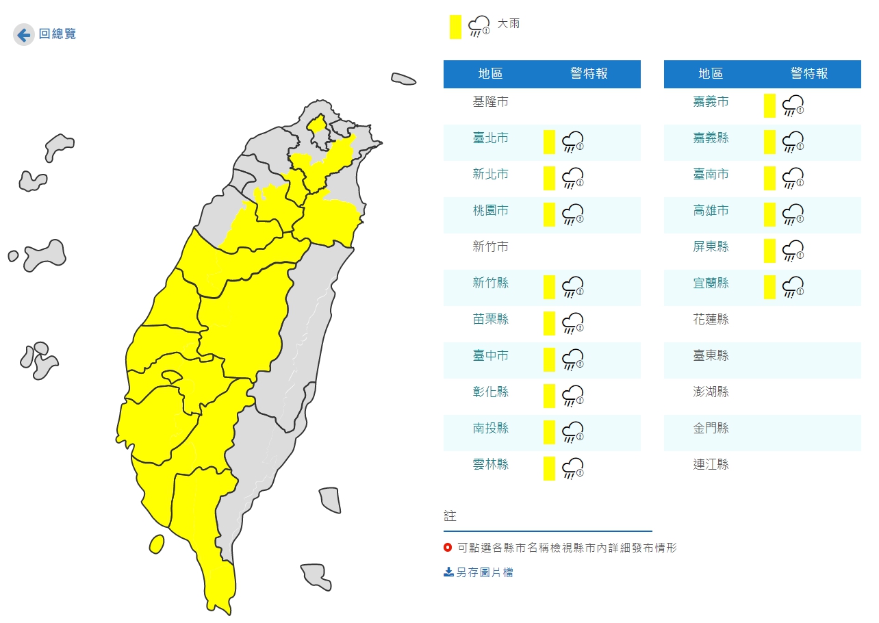 大雨特報地區為新北市、台北市、桃園市、苗栗縣、台中市、彰化縣、雲林縣、台南市、高雄市、宜蘭縣、新竹縣、嘉義縣、嘉義市、南投縣及屏東縣。