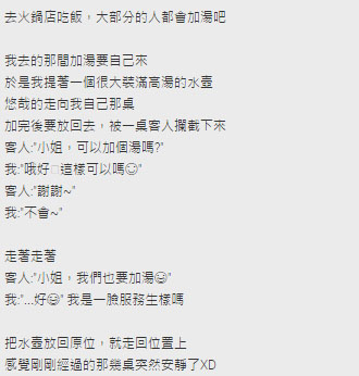 客人攔下,「小姐,可以加個湯嗎?」她也好心幫他們加湯,還問對方說:「這樣可以嗎?」客人也向她道謝,走著走著,沒想到又有客人把她叫住:「小姐,我們也要加湯」,她又再幫他們服務,心裡默默想說:「我是一臉服務生樣嗎?」之後就把水壺放回原位,走回位置上,「感覺剛剛經過的那幾桌突然安靜了XD」、「沒錯,我是客人不是服務生唷。」