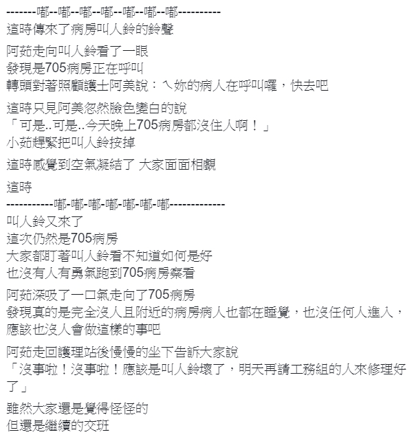 女網友在臉書社團《爆系故事館》發文,表示身為護理人員,在工作過程中難免會遇到令人匪夷所思的事,其中一個就是「半夜的鈴聲」她指出,某天凌晨12點大小夜班在交班時,705病房傳來鈴聲,同事阿茹轉頭告訴負責護理師阿美,「欸妳的病人在呼叫囉,快去吧」,不料對方卻臉發白地說,「可是…可是今天晚上705病房都沒住人啊!」阿茹當下趕緊將叫人鈴關掉,「這時感覺到空氣凝結了」。