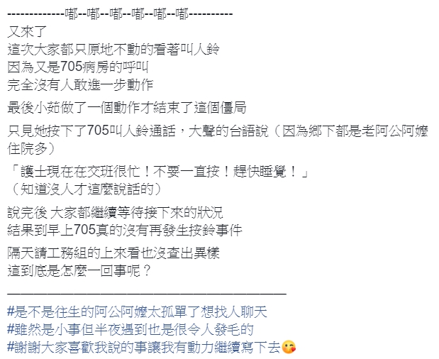 不料隔沒多久,705病房的鈴聲3度響起,這時,大膽的阿茹按下通話,用台語大聲喊話,「護士現在在交班很忙!不要一直按!趕快睡覺!」說完後,大家都心繫叫人鈴,深怕它再響起,不過神奇的是,護士站一路安靜到早上,「隔天請工務組檢查也沒查出異樣,這到底是怎麼一回事呢?」原PO最後也開玩笑說,「是不是往生的阿公阿嬤太孤單了,想找人聊天?」其他網友看了都發毛直呼,「我也遇過,在大罵後,就會安靜了」、「這種事每次遇到都覺得毛,立馬打電話給工務課」、「那時間真的好毛,但要是真的有人回話…應該也是會閃尿的吧」、「有回答就更恐怖了」、「真的好毛」。
