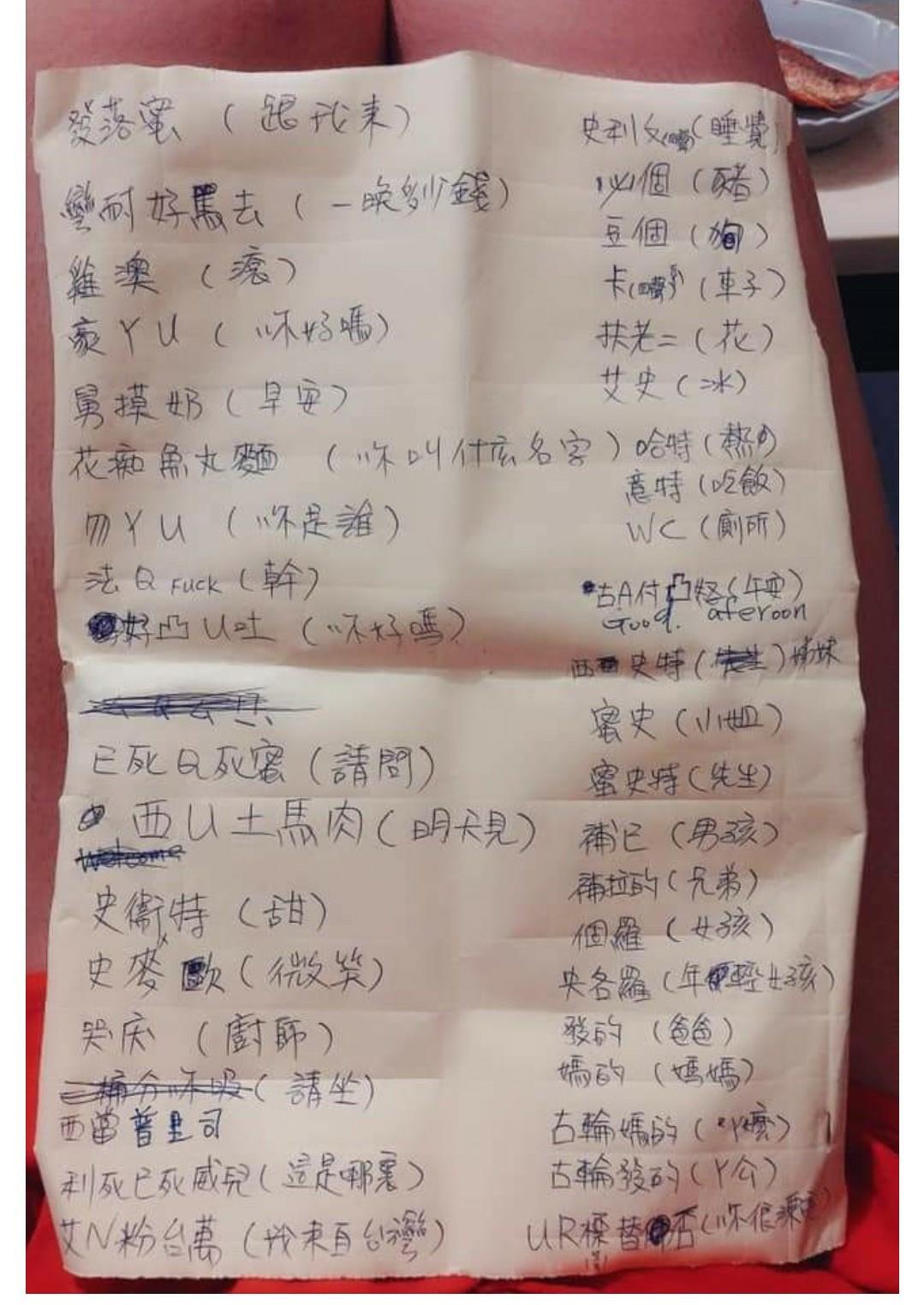這念法真的是太搞笑了!一名女網友把媽媽的英文筆記分享到「爆廢公社公開版」,更寫下「我只想問,她同事到底有多哈啦」,原來是同事教媽媽的英文唸法超逗趣,像是「扶老二」是flower的意思、「舅摸奶」是good morning、「彎耐好罵去」是one night how much、「已死Q死蜜」是excuse me等等。