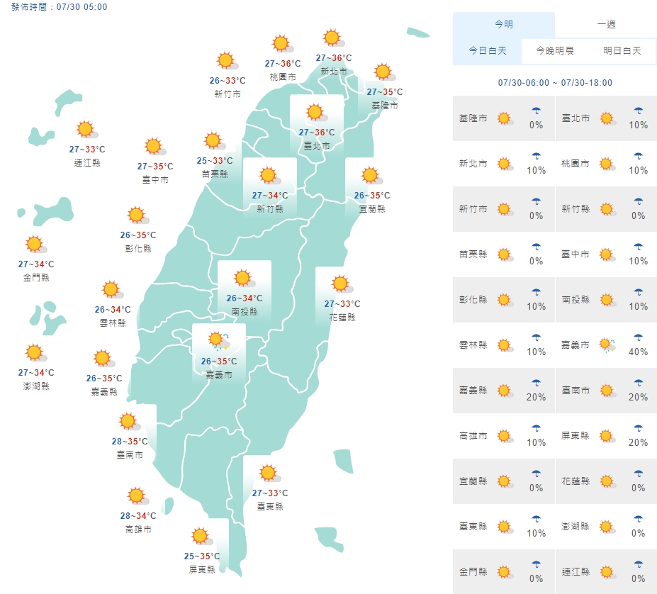 今(30)各地大多為晴到多雲,白天氣溫較高,僅東南部地區及恆春半島有局部短暫陣雨,午後中南部地區及北部山區有局部短暫雷陣雨。