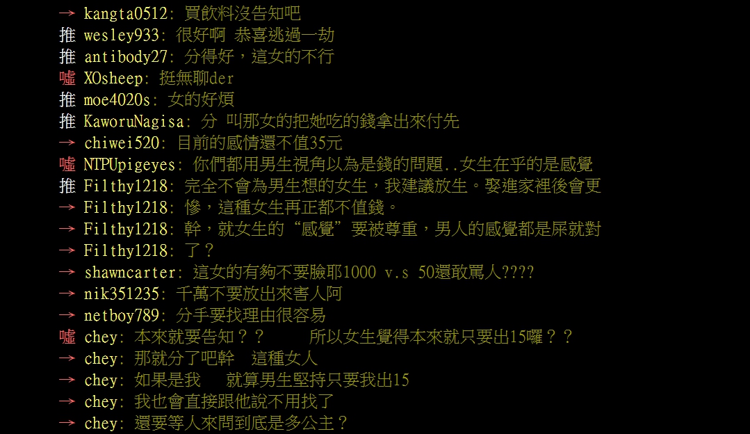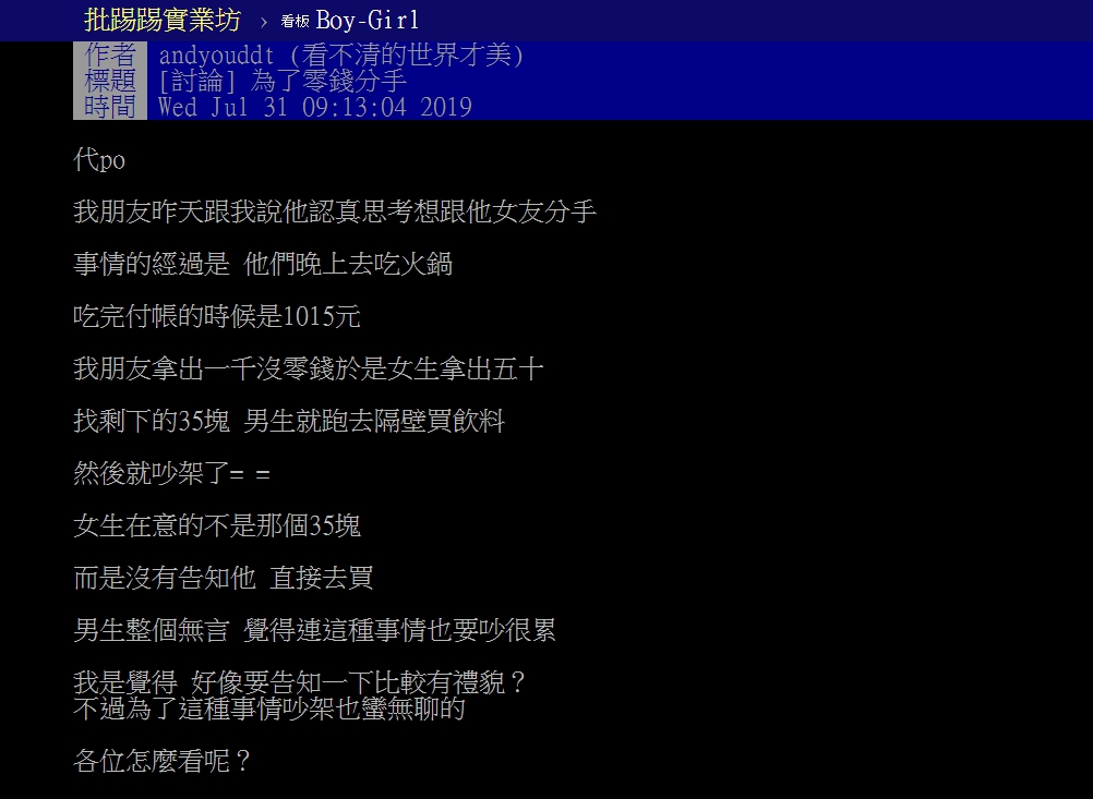 一名網友在《批踢踢》男女版發文,標題以「為了零錢分手」開頭,談到自己的友人近日對女友萌生了想分手的念頭,而35元竟是兩人吵架的導火線。女友事後向男友表示,會這麼生氣主要是因為沒有事先被告知,就直接拿去使用,認為自己沒被尊重,並不是在意那一點小錢才會和男友發脾氣,不過男友卻感到非常無言,認為兩人不必為了這種小事吵架傷感情。