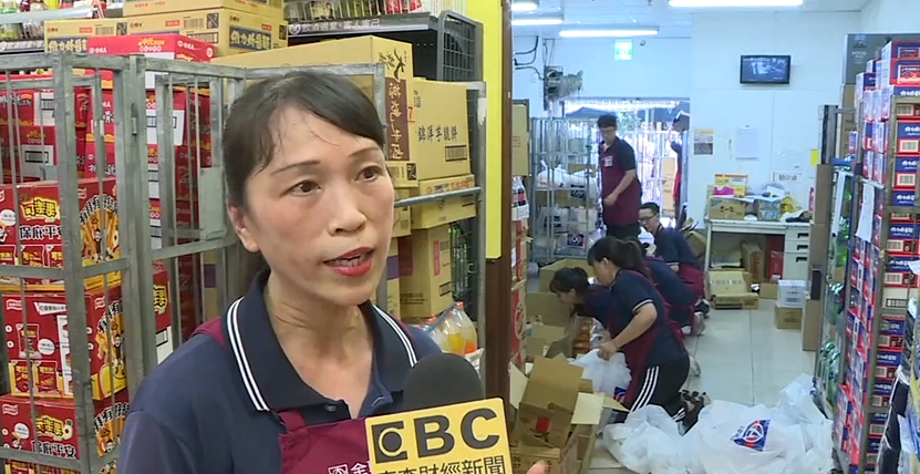 超市動員6個員工,有人負責撕開紙箱,有人把餅乾裝進大塑膠袋。