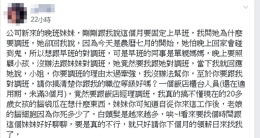 原PO在文章中表示,公司近日來了一名晚班的新人,但沒想到她就表示8月時想固定上早班,但詢問原因讓原PO大傻眼,新人表示「因為農曆七月到了,怕晚上回家遇到鬼,所以想調班。」且因為原本早班的同事是單親媽媽,下班必須顧小孩無法調班,結果這名新人就找上當經理的原PO,希望跟她調班。