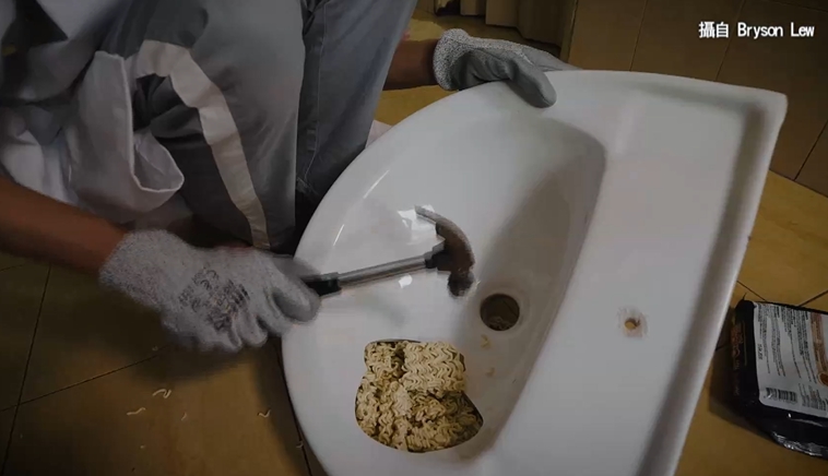電鑽用力鑽開地板仔細一看,裡面不是水泥,竟然是一塊一塊的泡麵,最近網路上流傳一段影片,號稱真的是泡麵修補術的實踐者,由於實在太神奇,不少youtuber都跟風實驗。